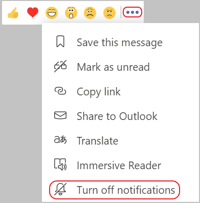 En una conversación de canal, vaya a la esquina superior derecha del mensaje original y seleccione Más opciones >Desactivar notificaciones.