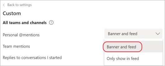 - Para recibir una notificación solo cuando @mentioned o cuando reciba respuestas a sus mensajes en canales, seleccione Menciones & respuestas